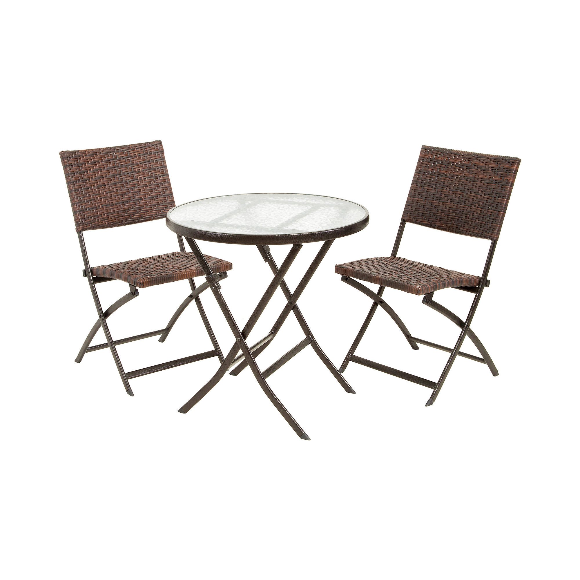 sturdy polyurethane wicker and iron construction table features a tempered glass top perfect for parties all pieces are easy to fold and store 3-piece set includes: folding table 2 folding chairs Rinse with mild soap and water